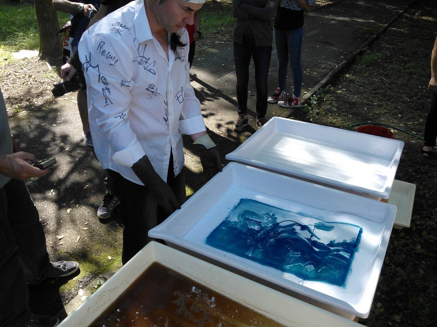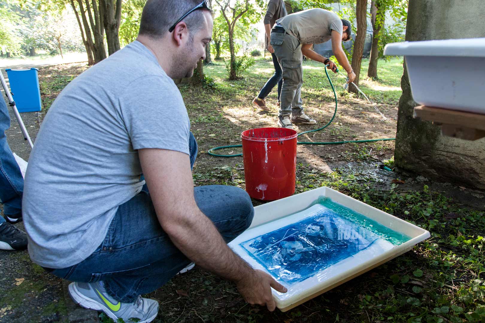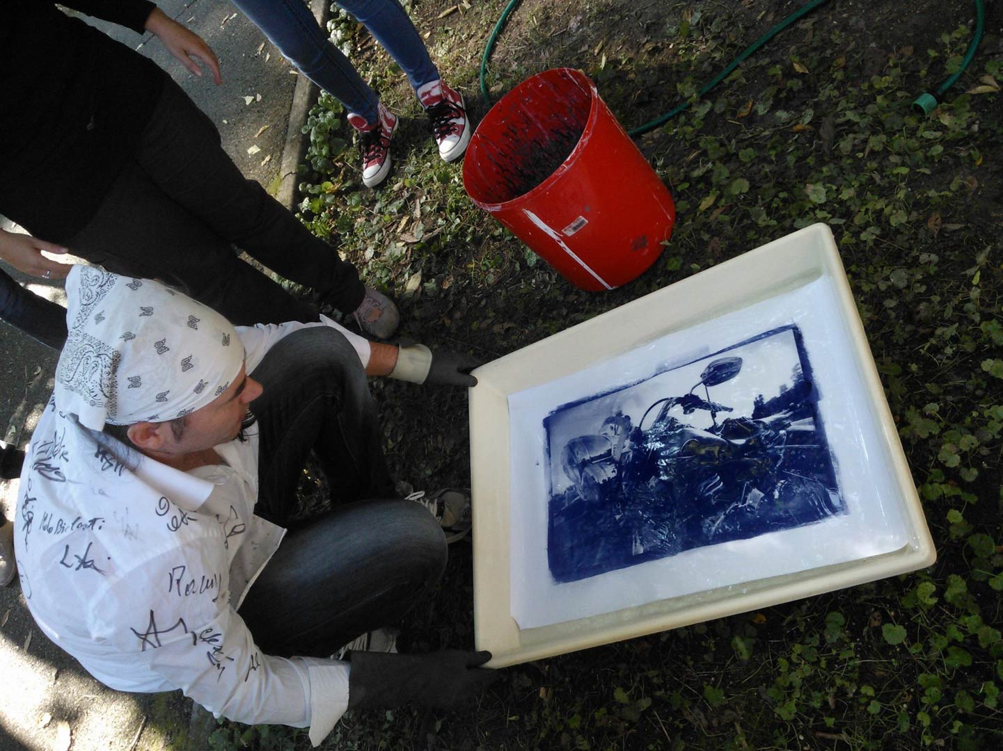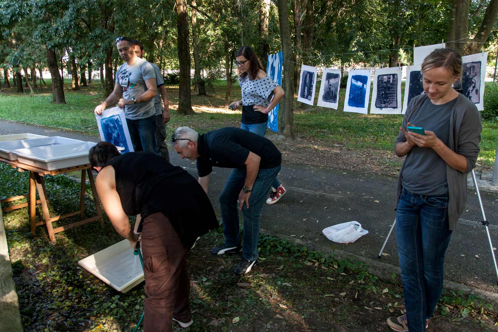 Dieci ore di sperimentazioni non-stop sul procedimento completo del cianotipo, viraggi e varianti, la partecipazione è completamente libera e gratuita e aperta ai curiosi di tutte le età.
